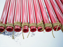 将钢管整齐排列在上料架上,通过链轮输送到烘道进行预热,预热温度300℃,时间15分钟。再次传送到上塑口进行成型。检验后进行固化,自然冷却后下料,再次成品检验后打包,堆放。